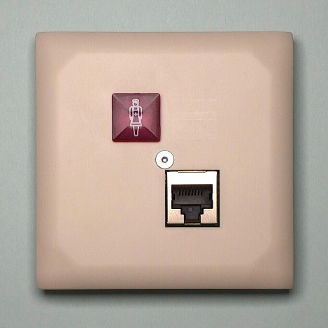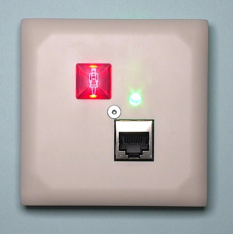 Ruftaster mit roter Beruhigungs-LED zum Auslösen von Rufen und Notrufen sowie mit einem zusätzlichen RJ45 Standardanschluss zum Anschließen der Birntaster für die Rufauslösung am Bett.