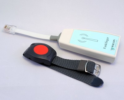 Des Weiteren kann in diesen Steckanschluss der Empfänger des schnurlosen Funktasters eingesteckt werden ( Funkfinger), um die Mobilität der Rufauslösung zu erweitern.