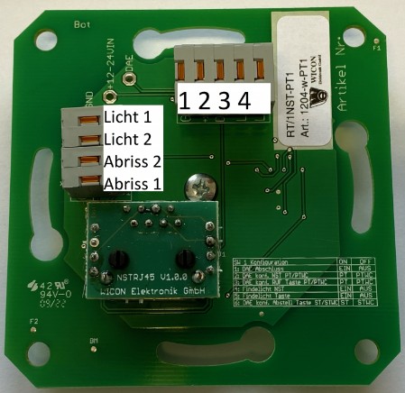 Taster sowie Steckanschluss für externe Rufmöglichekiten mit RJ-45-Stecker zum Auslösen Rufereignissen.