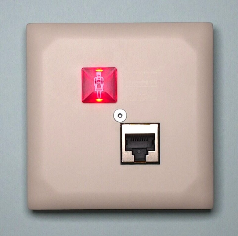 Ruftaster mit roter Beruhigungs-LED zum Auslösen von Rufen und Notrufen sowie mit einem zusätzlichen RJ45 Standardanschluss zum Anschließen der Birntaster für die Rufauslösung am Bett.
