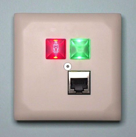Ruftaster mit roter Beruhigungs-LED zum Auslösen von Rufen und Notrufen sowie mit einem zusätzlichen RJ45 Standardanschluss zum Anschließen der Birntaster für die Rufauslösung am Bett.